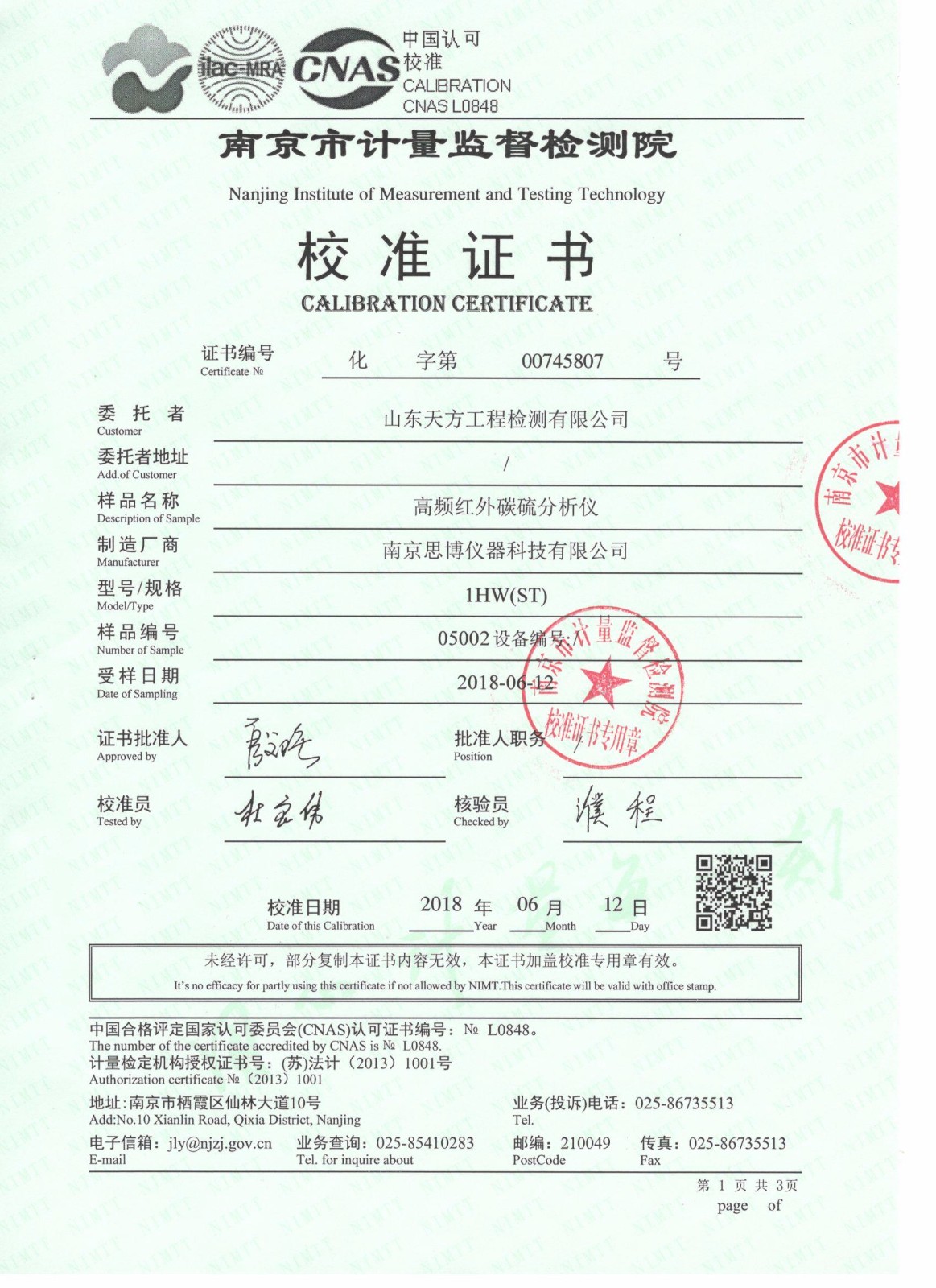 高頻紅外碳硫分析儀榮獲南京市計(jì)量監(jiān)督檢測院校準(zhǔn)證書
